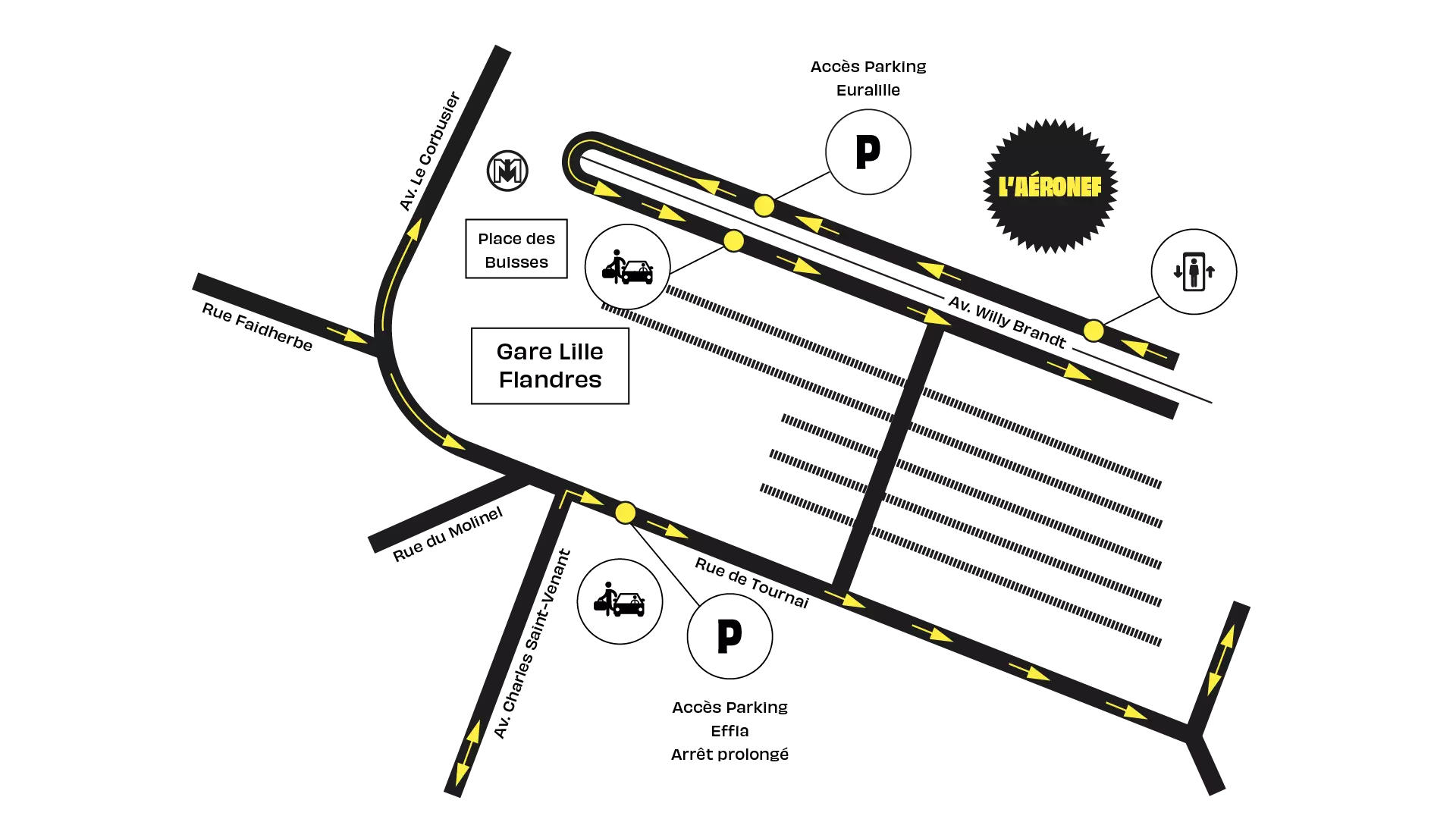 Vous pouvez également vous garer au parking de Lille Flandres (accès rue de Tournai) ou Lille Europe (accès Avenue le Corbusier) à 5 min. de L'Aéronef.